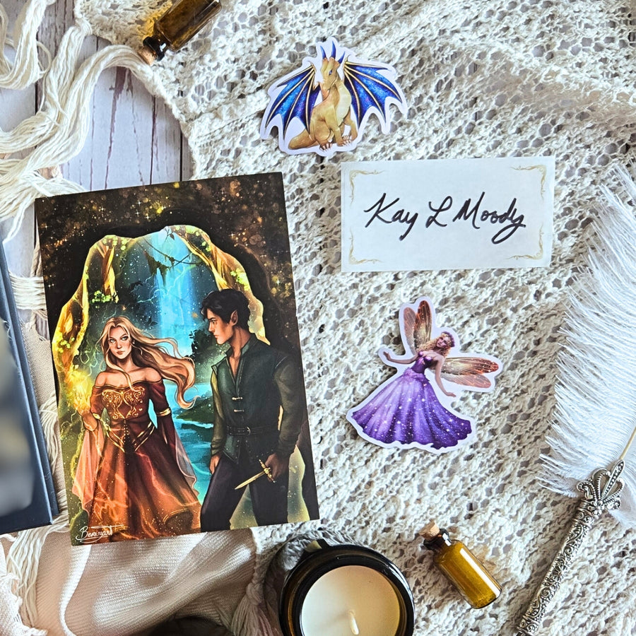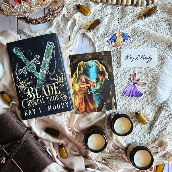 The companion swag pack for the book, Blade & Crystal Thorns by Kay L. Moody. This swag pack includes an art print and 2 vinyl stickers that go with the book, plus a SIGNED bookplate.
