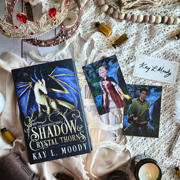 The companion swag pack for the book, Shadow & Crystal Thorns by Kay L. Moody. This swag pack includes 2 character cards that go with the book, plus a SIGNED bookplate.